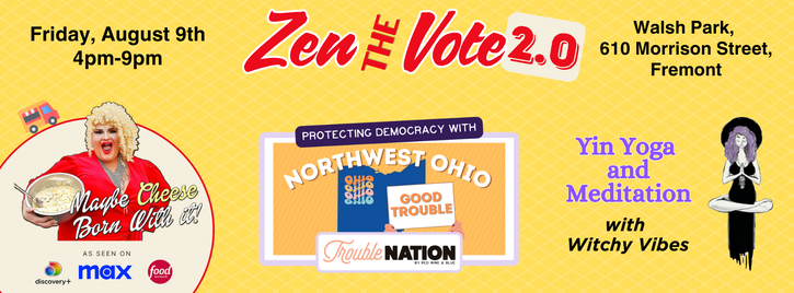 Get ready for an event that will nourish your body, mind, and soul! NW Ohio Good Trouble is thrilled to invite you to Zen the Vote 2.0 on August 9th, from 4pm to 9pm at Walsh Park in Fremont.