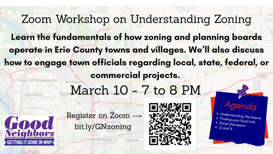 Join Good Neighbors Getting it Done in Western New York on March 10 at 7 PM for a free, nonpartisan, informational workshop on understanding zoning laws in Erie County town and villages. Register at https://bit.ly/GNzoning to get the Zoom info.